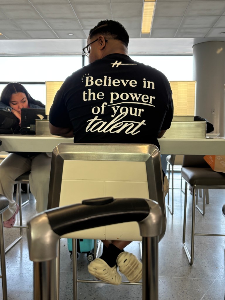 One day of hope stands out – The day I flew for her funeral in DR, as I walked to the gate in the airport, a former student remembered me, ‘Ms. Chavez?’… I could feel my eyes well up.. ‘Thank you for remembering me.’ I told her, ‘it means so much.’ … then as I sat at the gate, this man’s BACK spoke to me, ‘ Believe in the power of your talent.’ I knew I wasn’t alone.